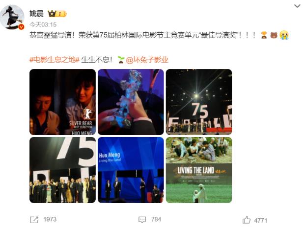 姚晨凌晨3点在社媒上发文:恭喜霍猛导演!荣获第75届柏林国际电影节主竞赛单元“最佳导演奖”!!!《生息之地》生生不息!