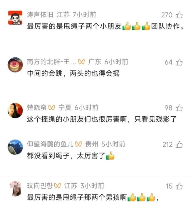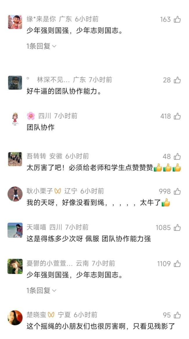 网友们在评论区纷纷表达了对这支队伍的赞赏。有人感叹他们的默契度非常高,还有人说“少年强则国强,少年志则国志”,认为这样的活动比刷题更健康。更有网友特别提到甩绳子的人也非常厉害。大家都为这些孩子们点赞。