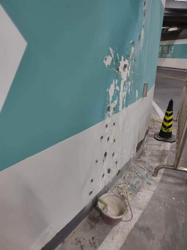 从市民发布的图片中可以看到,地下停车场入口墙面上排布有多处凸起的针状物体。市民认为这是商场保护墙面的举措,并质疑这种做法可能会损坏车辆。记者实地走访时发现,入库下坡时的左手边有一名施工人员正在对墙面进行处理,大部分“钉子”的凸起部分已被割除。现场也设置了围栏以保护施工环境。
