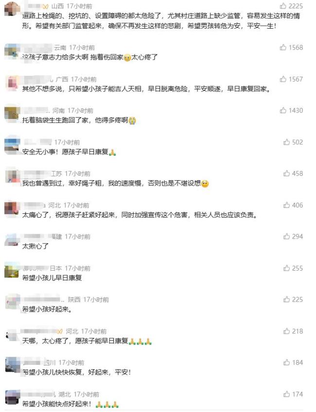 此事发生于4月4日下午,男孩骑电动自行车外出补课时遭遇意外,事发地位于村中一条公共通行村道。拉绳者是一名70岁左右的同村村民。目前,受伤男孩已被转入北京的医院接受救治,当地警方已介入调查。