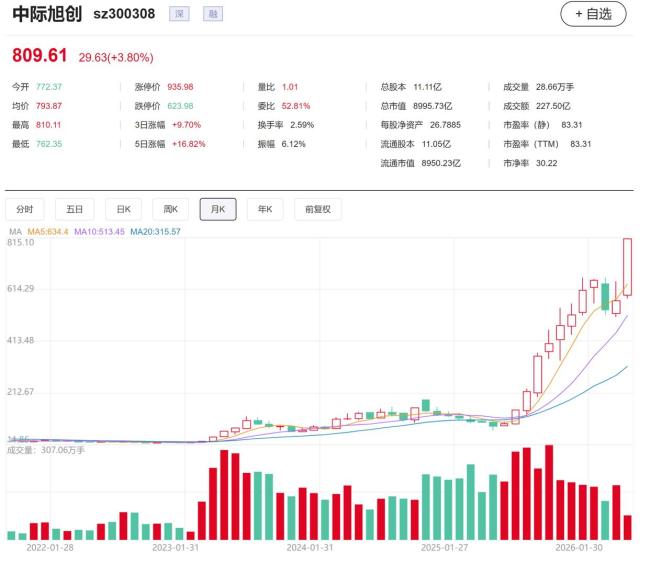 中际旭创股价今日收涨3.8%,报收于809.61元,总市值逼近9000亿元关口。该股在去年涨幅接近四倍的基础上,今年继续上涨超过30%。