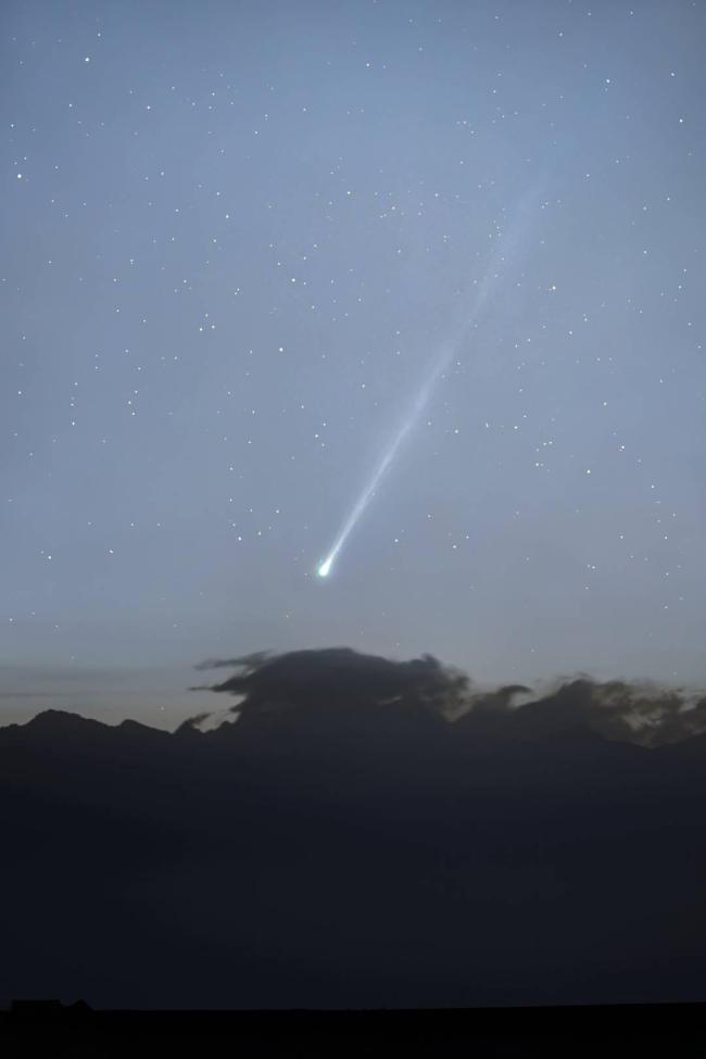 4月14日,杨雳鹏在新疆乌鲁木齐南山等待了一晚,终于在早上5-6点拍到了彗星。尽管天气不太好,是多云天气,影响了拍摄效果,但他还是拍到了R3彗星拖着长长的彗尾。他表示,很可能是因为R3彗星已经非常接近近日点,彗星物质剧烈挥发,加上特殊的几何关系,使彗尾亮度显著增强,在地面上看,R3彗星有着非常长的彗尾。