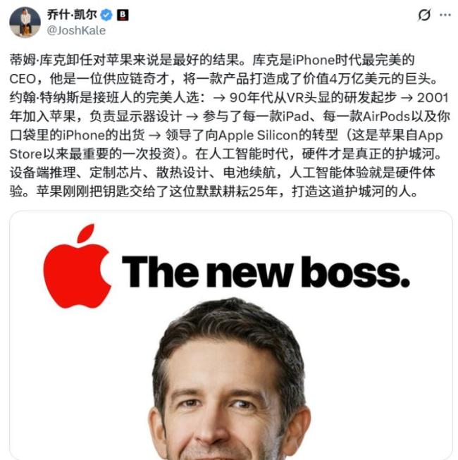 新CEO约翰·特努斯于2001年加入苹果,从产品设计团队做起,2021年起担任硬件工程高级副总裁。他管理着iPhone、Mac、iPad、AirPods和Vision Pro等全线硬件产品。特努斯被视为硬件领域的专家,将在AI时代继续巩固苹果的硬件优势。