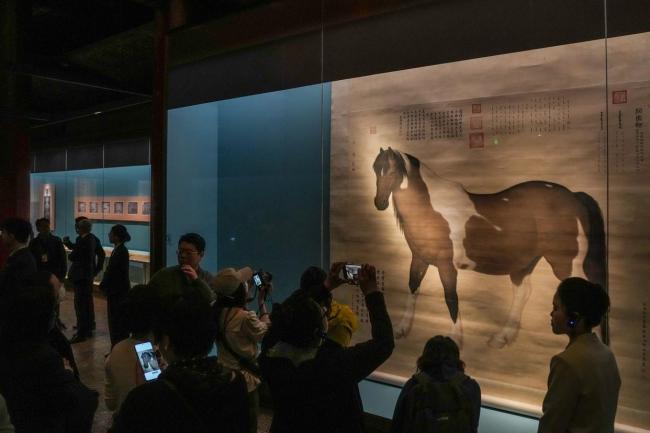 此次展览名为“神骏:故宫书画艺术中的马世界”,共展出了55件与马相关的书画作品,其中20件是国宝级别,包括金代赵霖的《昭陵六骏图》、元代任仁发的《出圉图》以及清代郎世宁的《阚虎骝图》等历代画马名作。此外,还有28件未曾展出过的精彩作品首次亮相,如记录了“马厩养猴”习俗的《百马图》卷。
