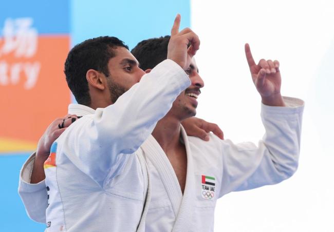 4月23日,在海南三亚举行的第六届亚洲沙滩运动会柔术男子62公斤级决赛中,阿联酋选手哈立德·阿尔谢希战胜了另一名阿联酋选手奥马尔·阿尔苏韦迪,夺得金牌。比赛中,两名选手展现了高超的技艺和激烈的竞争。赛后,他们互相致意,体现了体育精神。