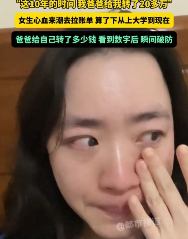 女生拉账单发现爸爸10年转了20多万 默默付出的父爱。江苏一位女子在家闲来无事时,翻看了自己近十年的账单。看着看着,她的眼眶红了。从她上大学开始,父亲已经陆续给她转账了20多万。平时一笔笔转账没什么感觉,但当她把这些年所有的记录汇总在一起时,才意识到父亲一直在默默支持她,从未提过一句难处。