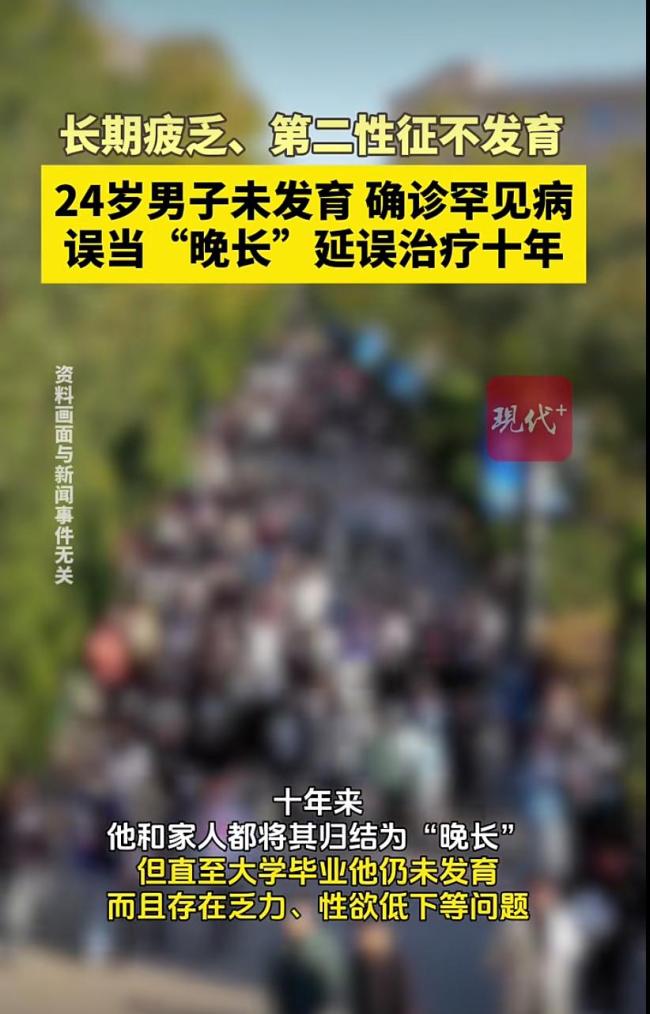 24岁男子未发育确诊罕见病 十年误诊终得解。小张今年24岁,自童年起发育显著缓慢,青春期从未真正开始。多年来,他和家人认为这是“晚长”,但直至大学毕业仍未见发育,且伴有乏力、性欲低下等症状。