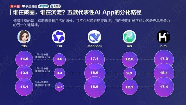 将观察周期拉长至2026年1月至3月,代表性AI应用的增长路径已明显分化。豆包体现了头部入口的先发优势,其声量从241.9万跃升至843.2万,MAU也从3.33亿增至5.20亿,两项指标稳居第一,人均单日使用时长始终维持在14至15分钟,不仅巩固了领先优势,且使用深度并未被稀释。