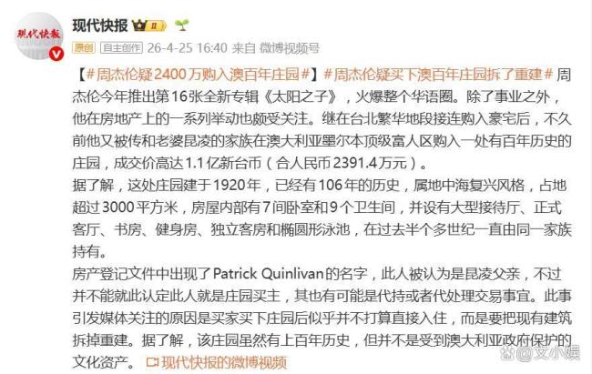 这一操作引发网友猜测:“所以是周董出钱,老丈人出面代持?”但也有媒体指出,虽然房产登记文件中出现的Patrick Quinlivan被认为是昆凌父亲,但这并不能直接认定他就是庄园买主,也有可能只是代持或处理交易事宜。更令人惊讶的是,有消息称买家买下庄园后并不打算直接入住,而是计划拆掉现有建筑重建。尽管这栋庄园有上百年历史,但它并不受澳大利亚政府保护,属于可拆除范畴。