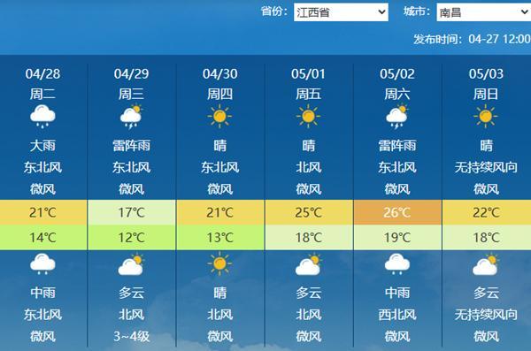 今天下午,江西降雨将逐渐增多,夜间至29日有一次较明显的降水、降温及大风天气过程。多地将出现大到暴雨,气温显著下降,南昌最高气温将从30℃以上降至17℃,湿凉感明显,需做好防雨和保暖措施。