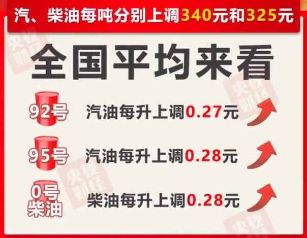全国平均来看:92号汽油每升上调0.27元,95号汽油每升上调0.28元,0号柴油每升上调0.28元。